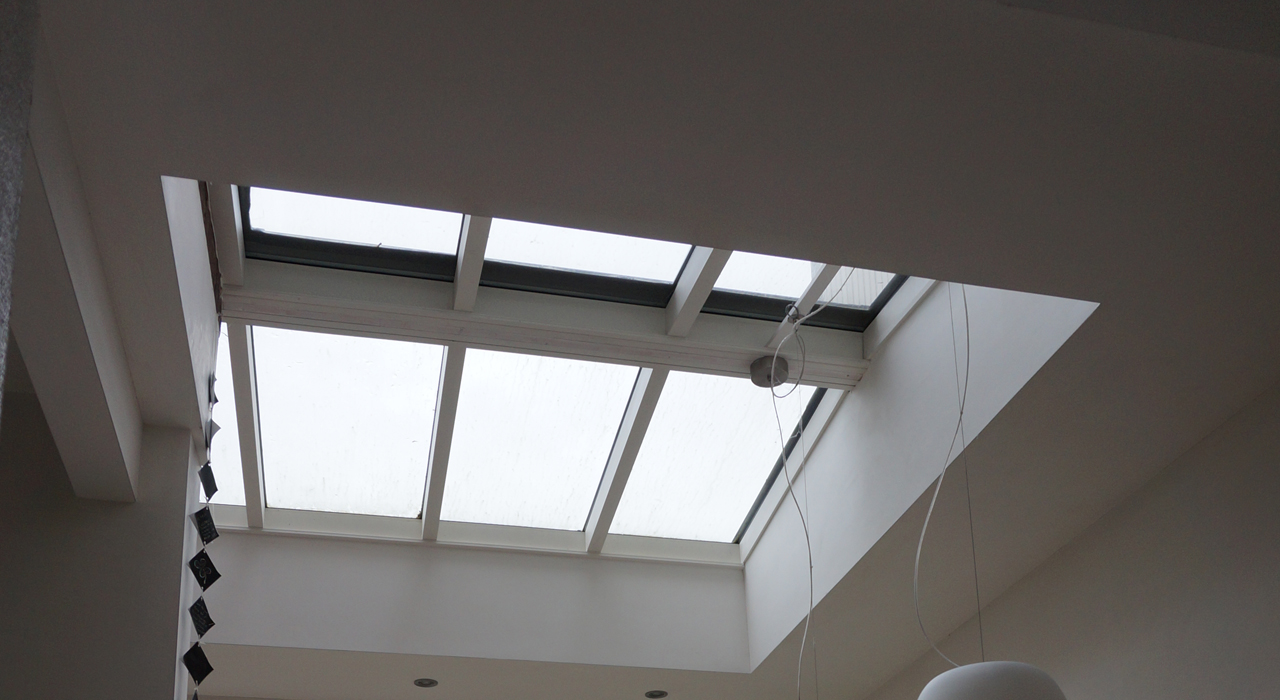 To ensure enough light entering the space on the groundfloor a large roof light has been added. The roof light is 'folding' itself around the original kitchen. This gesture enhances the spaciousness of the new extension.